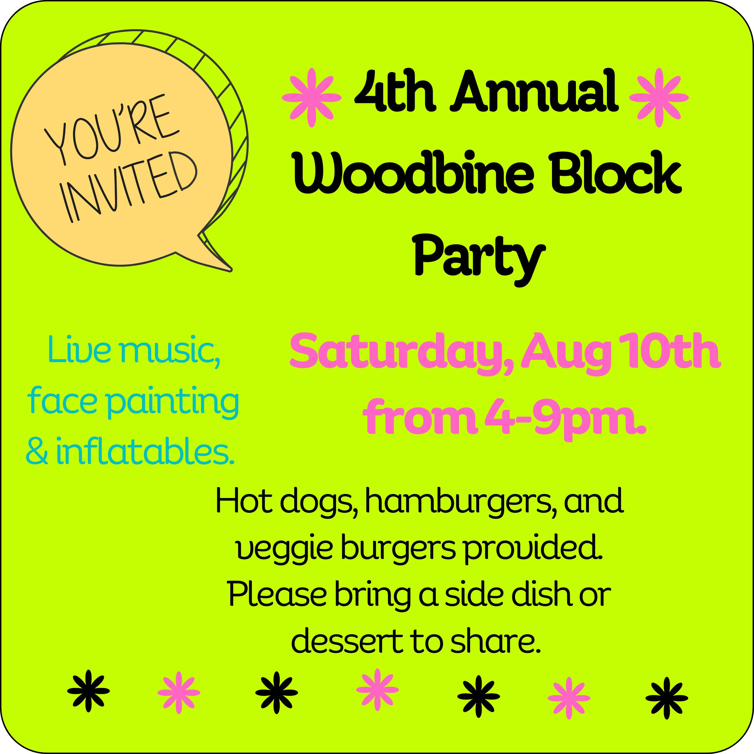 4th Annual Woodbine Drive Block Party – Saturday, August 10th 4-9pm
