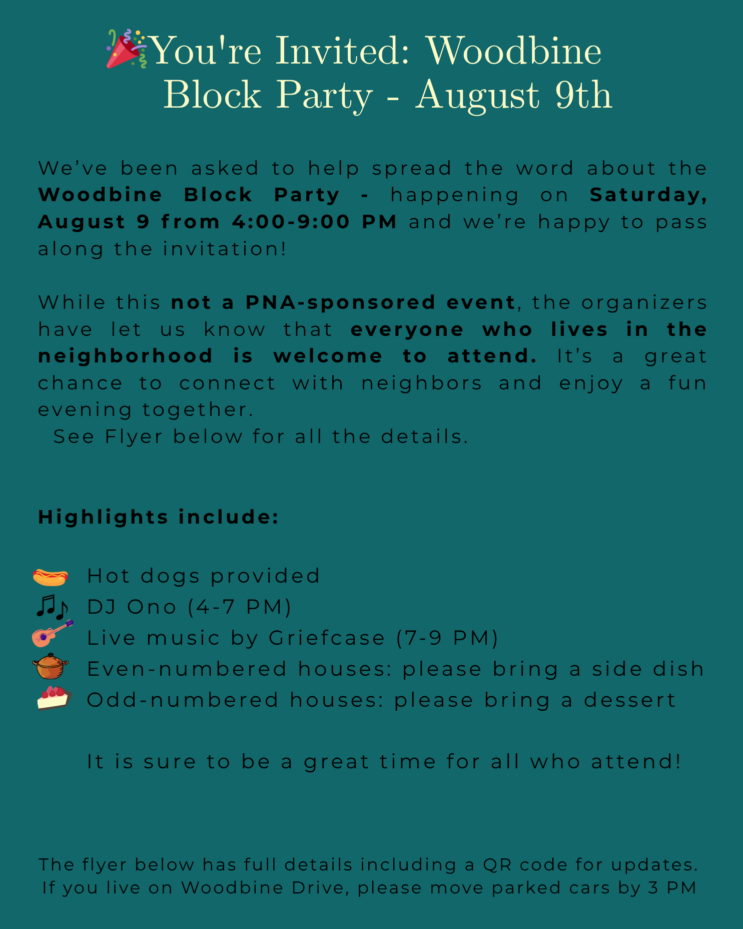 🎉You’re Invited: Woodbine Block Party – Saturday, August 9th! Posted on July 20, 2025 by katydidnent Share this: Click to email a link to a friend (Opens in new window) Email Click to print (Opens in new window) Print Click to share on Facebook (Opens in new window) Facebook Click to share on Pinterest (Opens in new window) Pinterest Click to share on X (Opens in new window) X More Click to share on LinkedIn (Opens in new window) LinkedIn Click to share on Tumblr (Opens in new window) Tumblr Click to share on Reddit (Opens in new window) Reddit Like Loading... Related