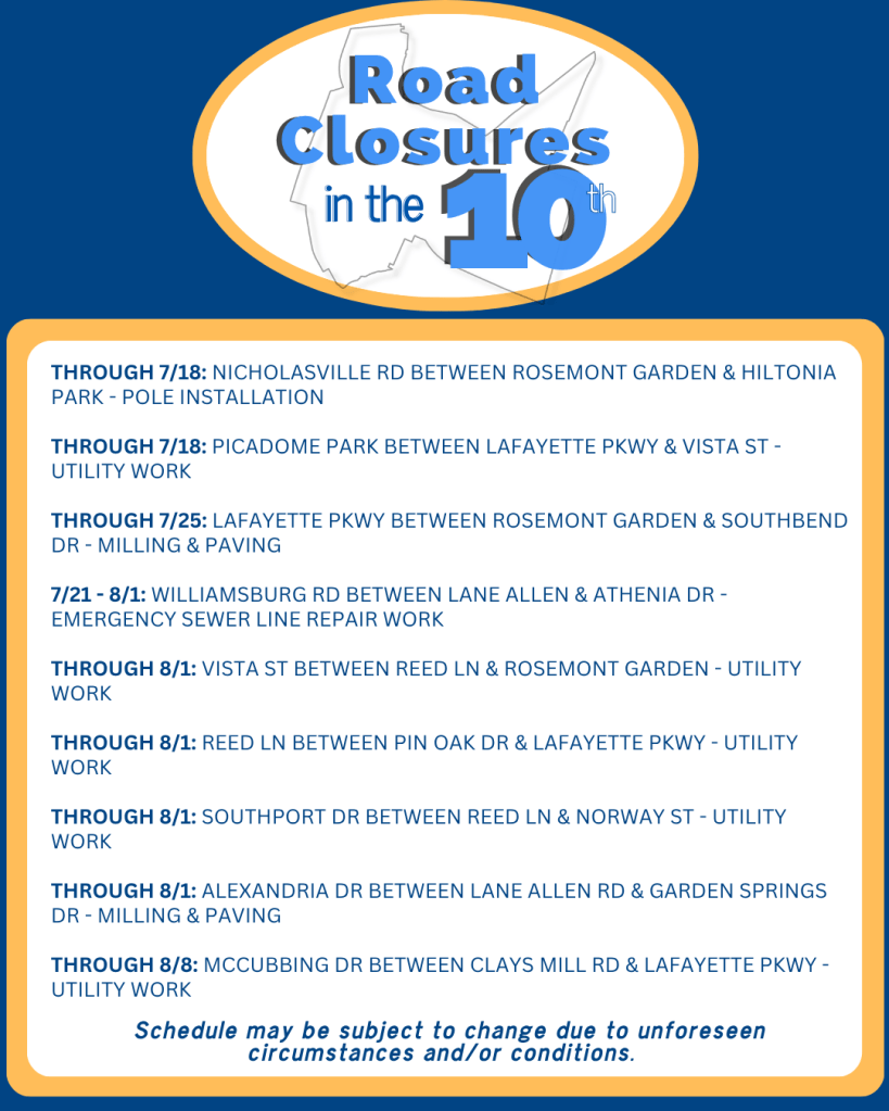 See below for road closures in Lexington’s 10th District: Updated 7/21 Image Posted on July 22, 2025 by katydidnent Share this: Click to email a link to a friend (Opens in new window) Email Click to print (Opens in new window) Print Click to share on Facebook (Opens in new window) Facebook Click to share on Pinterest (Opens in new window) Pinterest Click to share on X (Opens in new window) X More Click to share on LinkedIn (Opens in new window) LinkedIn Click to share on Tumblr (Opens in new window) Tumblr Click to share on Reddit (Opens in new window) Reddit Like Loading... Related