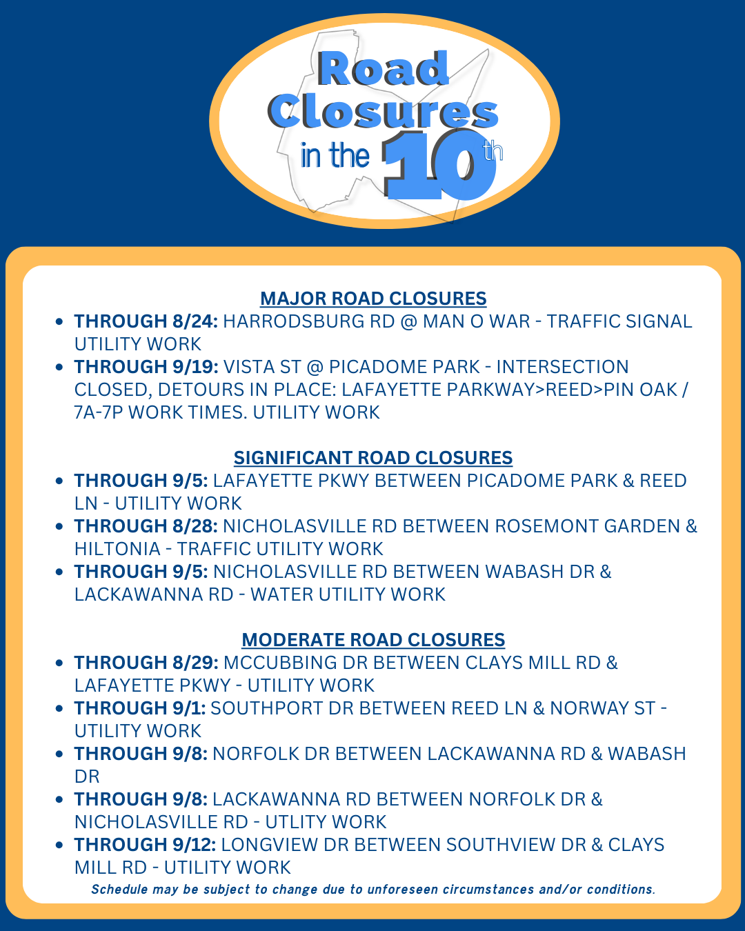 Continued road closures and utility work in our area. Please see below for dates and details. Some closures are already in effect and others will continue into September, so be sure to check before you head out and allow extra travel time. Detours are posted, but it’s always good to plan ahead.