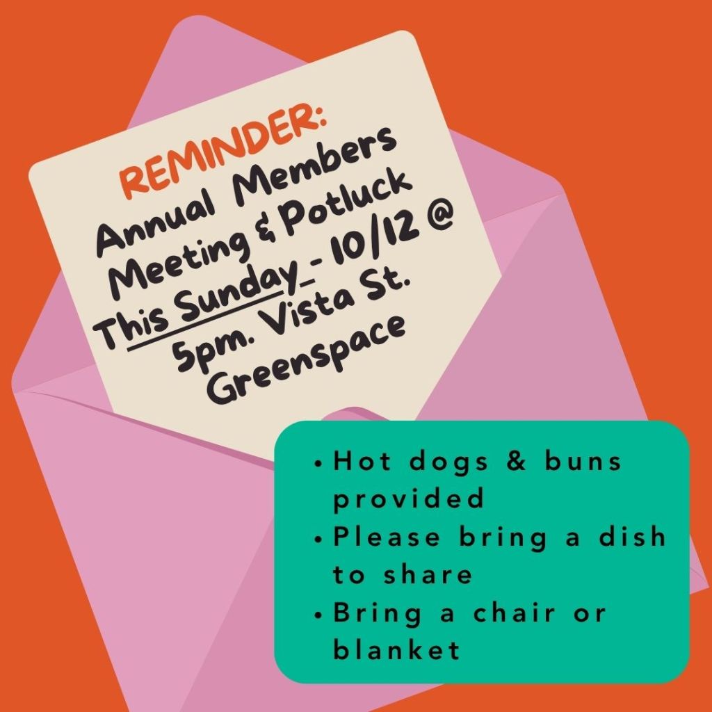 Just a quick reminder that we have rescheduled our annual members’ meeting due to the Lafayette Band Invitational. We will be meeting on Sunday, October 12th from 5-7pm in the Vista Street Greenspace. Hotdogs and buns provided. Please bring a chair and a side dish, appetizer, or dessert to share. We will be holding board elections this evening as well.